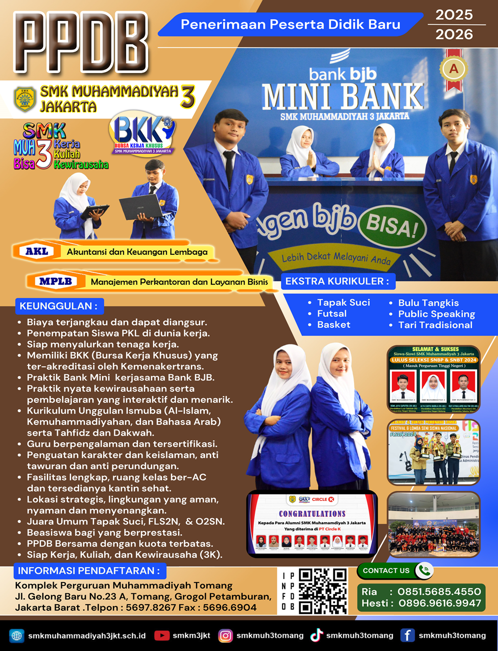 Selamat datang di situs web resmi Sistem Penerimaan Peserta Didik Baru Online SMK Muhammadiyah 3 Jakarta Tahun Pelajaran 2025/2026. Peserta didik dapat mendaftar secara online melalui sistem ini atau bisa daftar langsung datang ke sekolahBagi calon siswa silahkan mengisi formulir pendaftaran pada menu formulir pendaftaran, Jika ada kesulitan bisa menghubungi panitia.